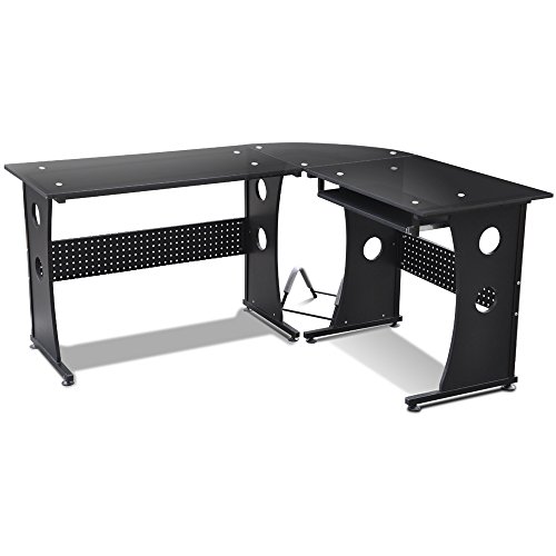 - Black Glass L-Shape Desk/Slide out shelf for keyboard/Shelf for PC base